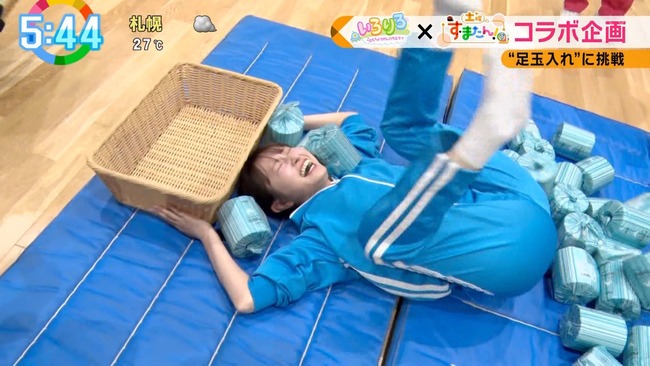 【画像】す・またんの佐藤佳奈アナ、仰向けの胸がエッチなストレッチをやらされる